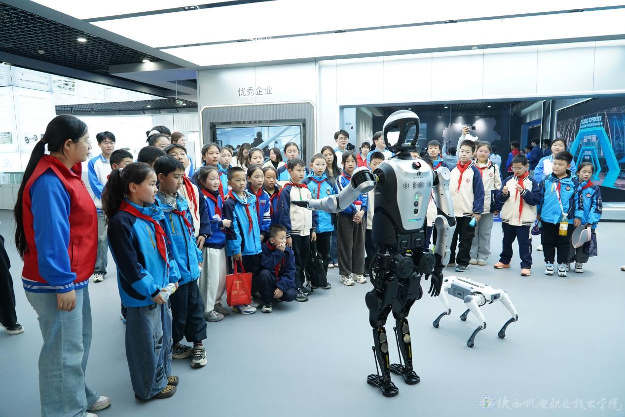 活动中,小学生们以“小小工程师”身份,依次参观了钛展馆、全息投影实训室、风标产业学院、精雕智造中心及多个机器人实训室,近距离观察钛合金样品,体验全息互动,了解数控机床与智能制造。在匠心楼,工业机器人展示写毛笔字、画图、走迷宫等技能;双臂机器人、自动化产线及臊子面智能产线演示引人入胜。最后,机器狗与人形机器人的精彩表演赢得孩子们阵阵欢呼。